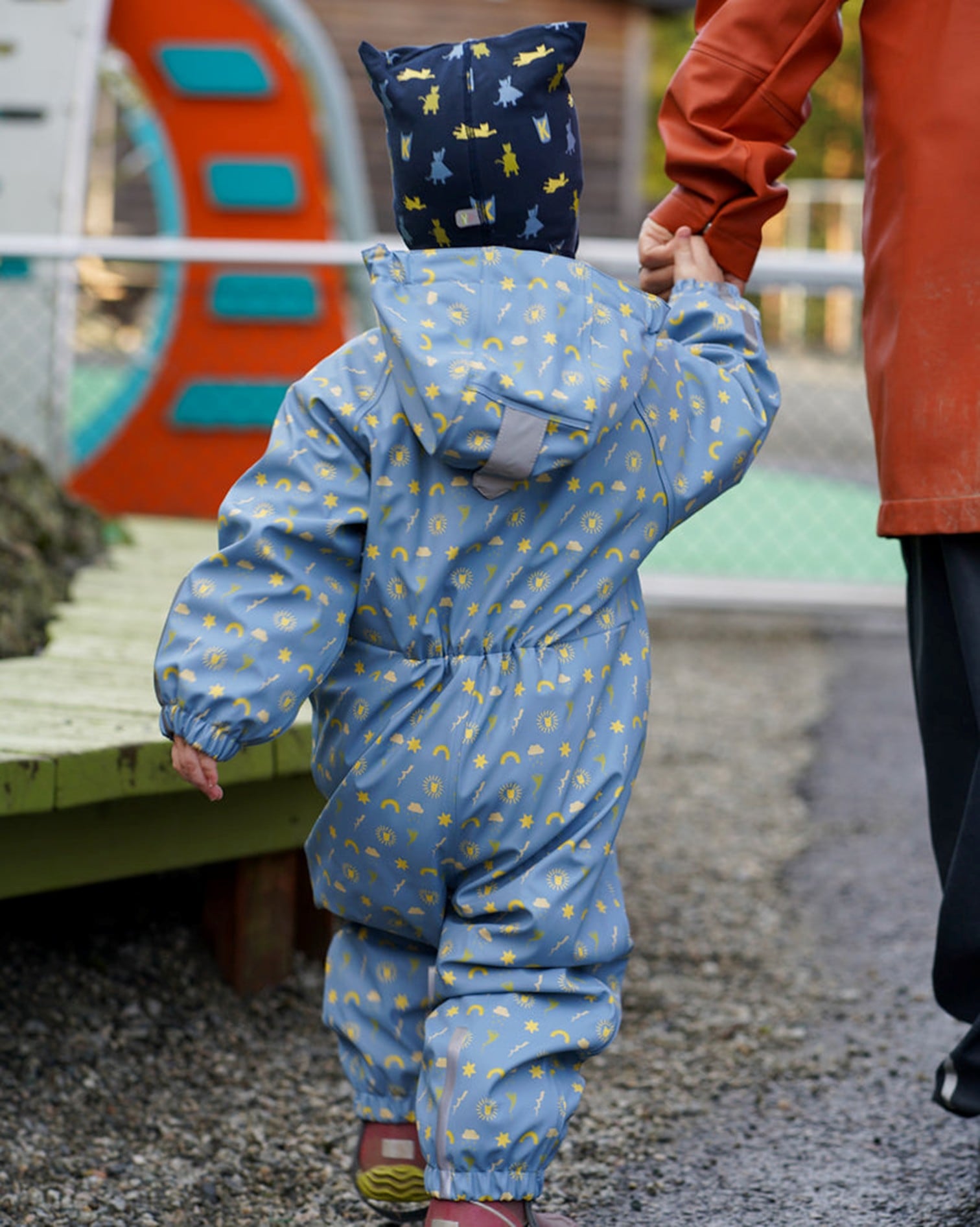 Regndressen er lett vattert og holder barnet varmt og komfortabelt. Den er utstyrt med slitesterke fotstropper som holder dressen på plass, navnelapper for enkel merking og reflekser for økt synlighet i mørket. Vannstoppere på ermer og ben hindrer vann i å trenge inn, og sveisede sømmer sørger for at dressen er helt vanntett. Hetten kan tas av og justeres etter behov, noe som gir ekstra sikkerhet.
