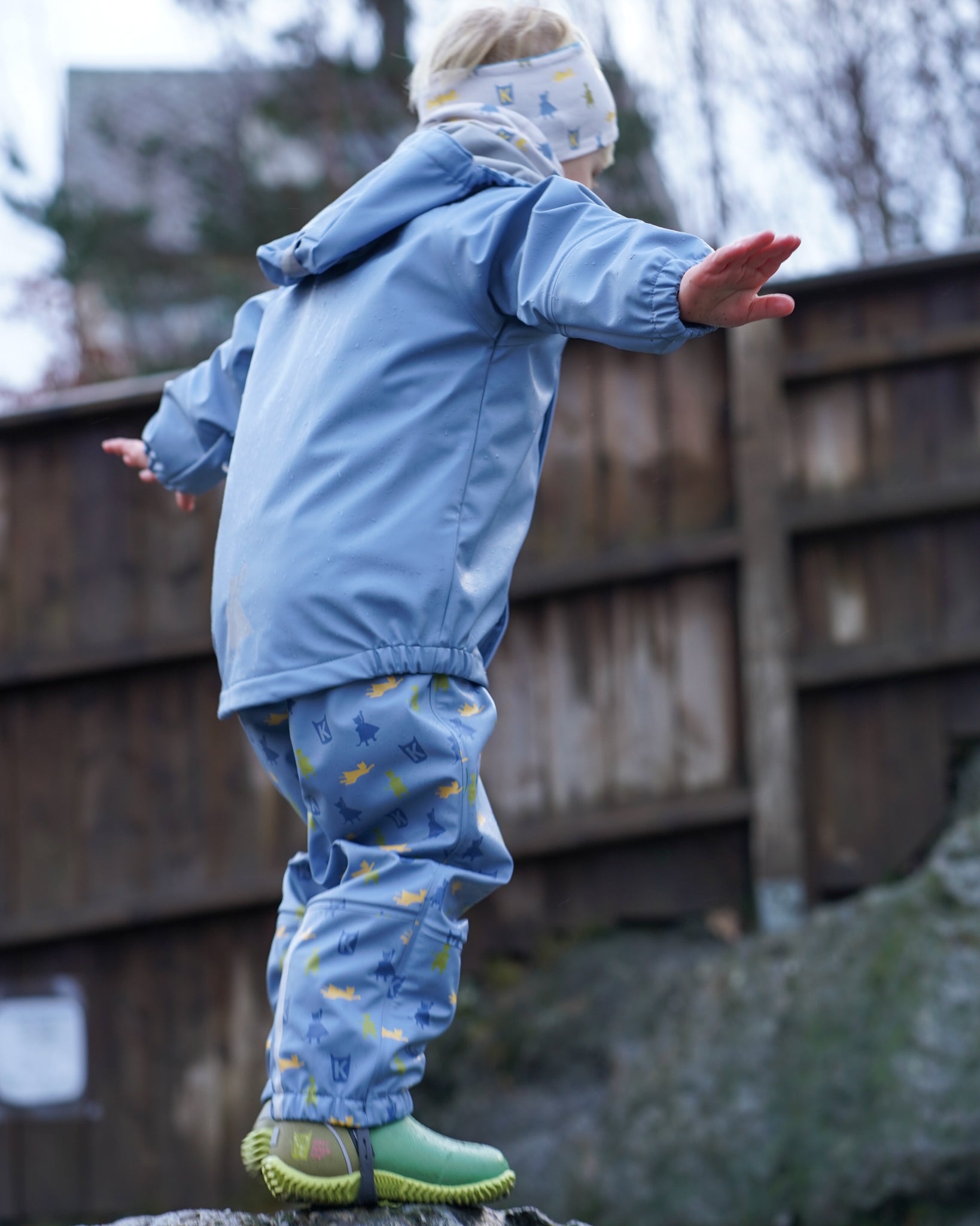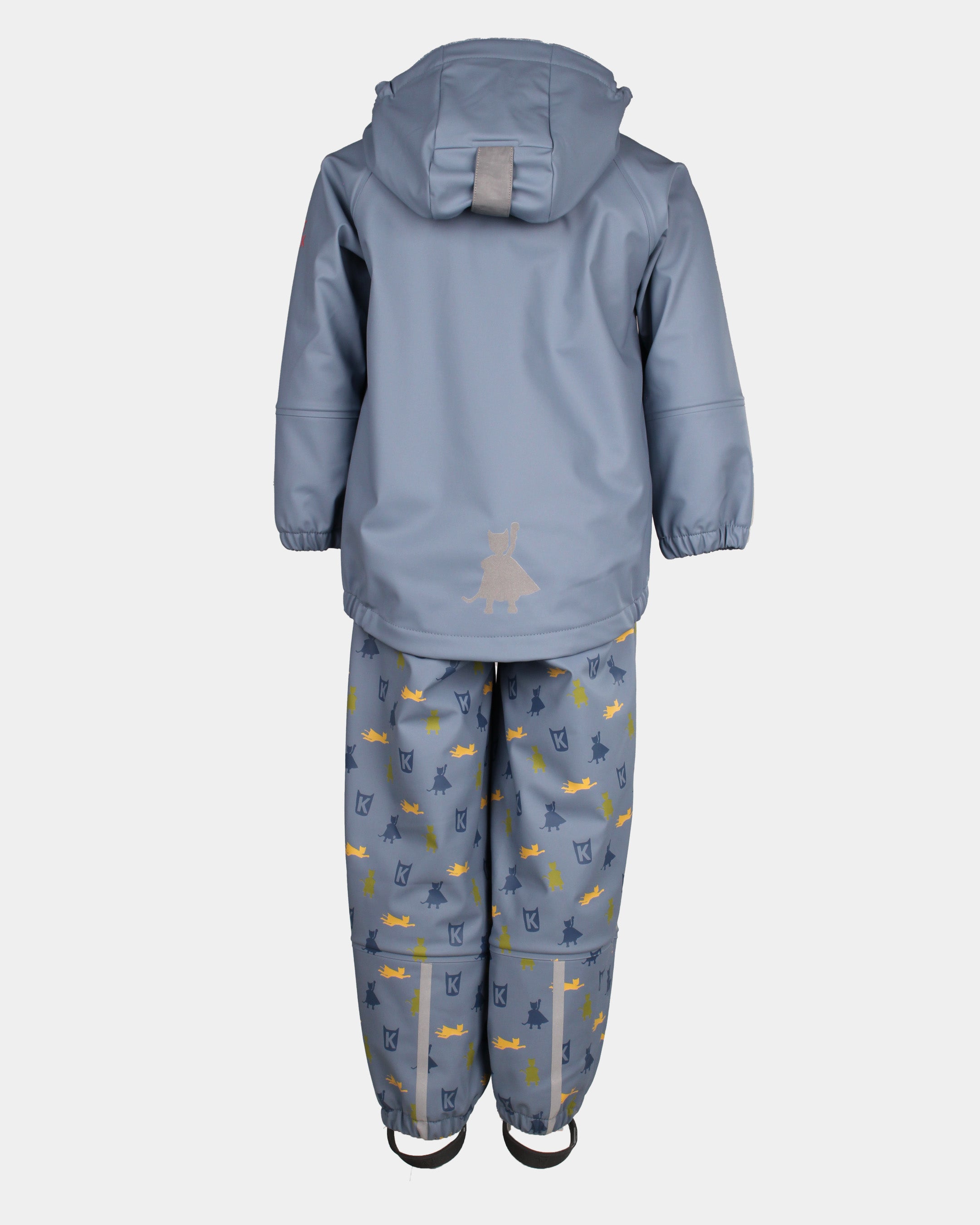 Består av både jakke og bukse i slitesterkt PU-materiale med børstet innside for ekstra komfort. Kragen er foret med myk fleece, og vannstoppere i både ermer og ben sørger for at du holder deg tørr hele dagen. Settet er utstyrt med solide gummistropper under føttene, refleksdetaljer på både jakke og bukse, og fine mønstre og detaljer som gir det et ekstra stilig preg. Jakken har sveisede sømmer og en trygg hette som kan justeres eller fjernes etter behov.