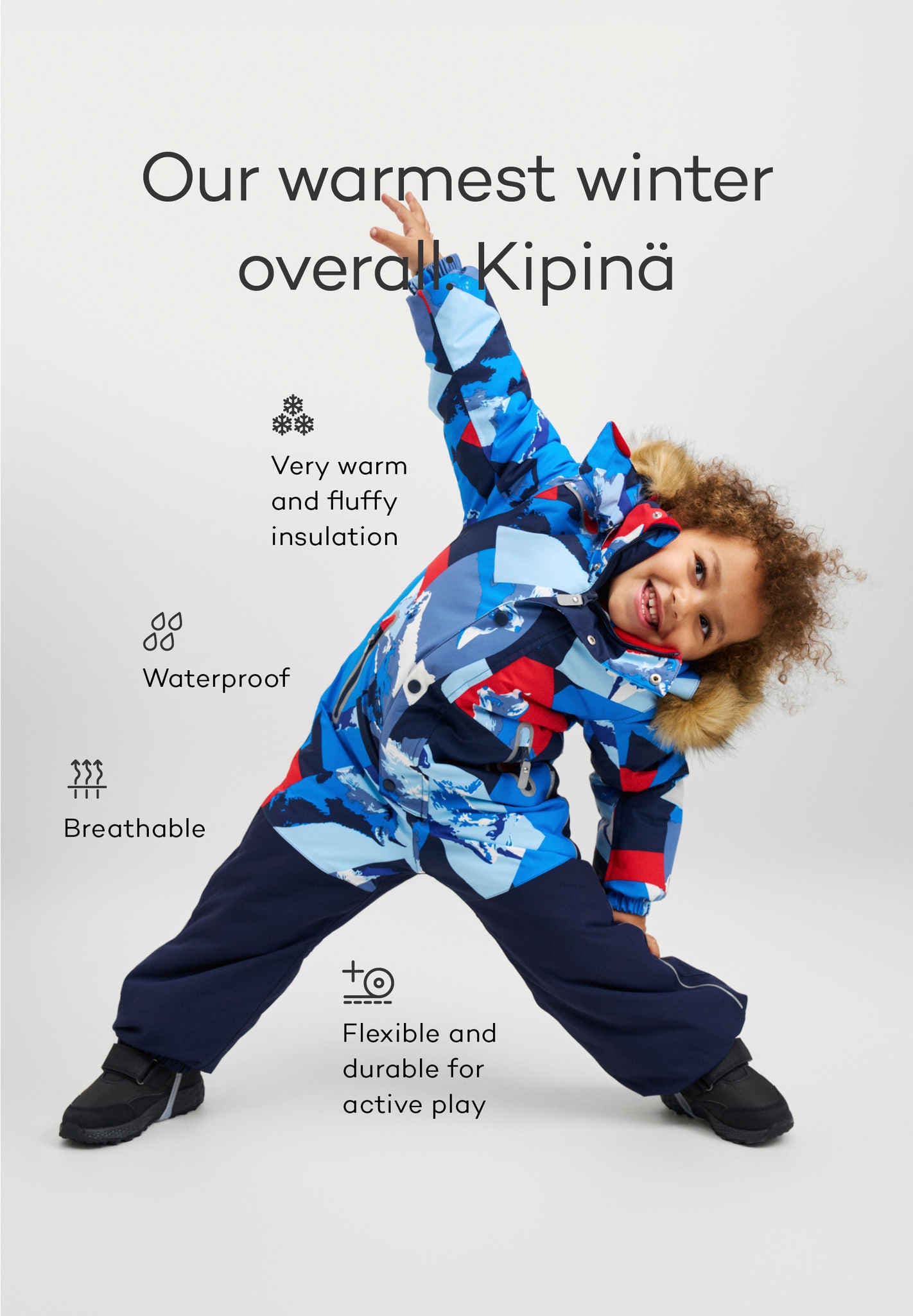 Reima Kipina er en svært varm Reimatec-vinterdress designet for aktive barn, med en stretchy overdel og ekstra slitesterk underdel. Den er helt vanntett og har en rett passform. Perfekt for lek i snøen og andre utendørs vinteraktiviter!