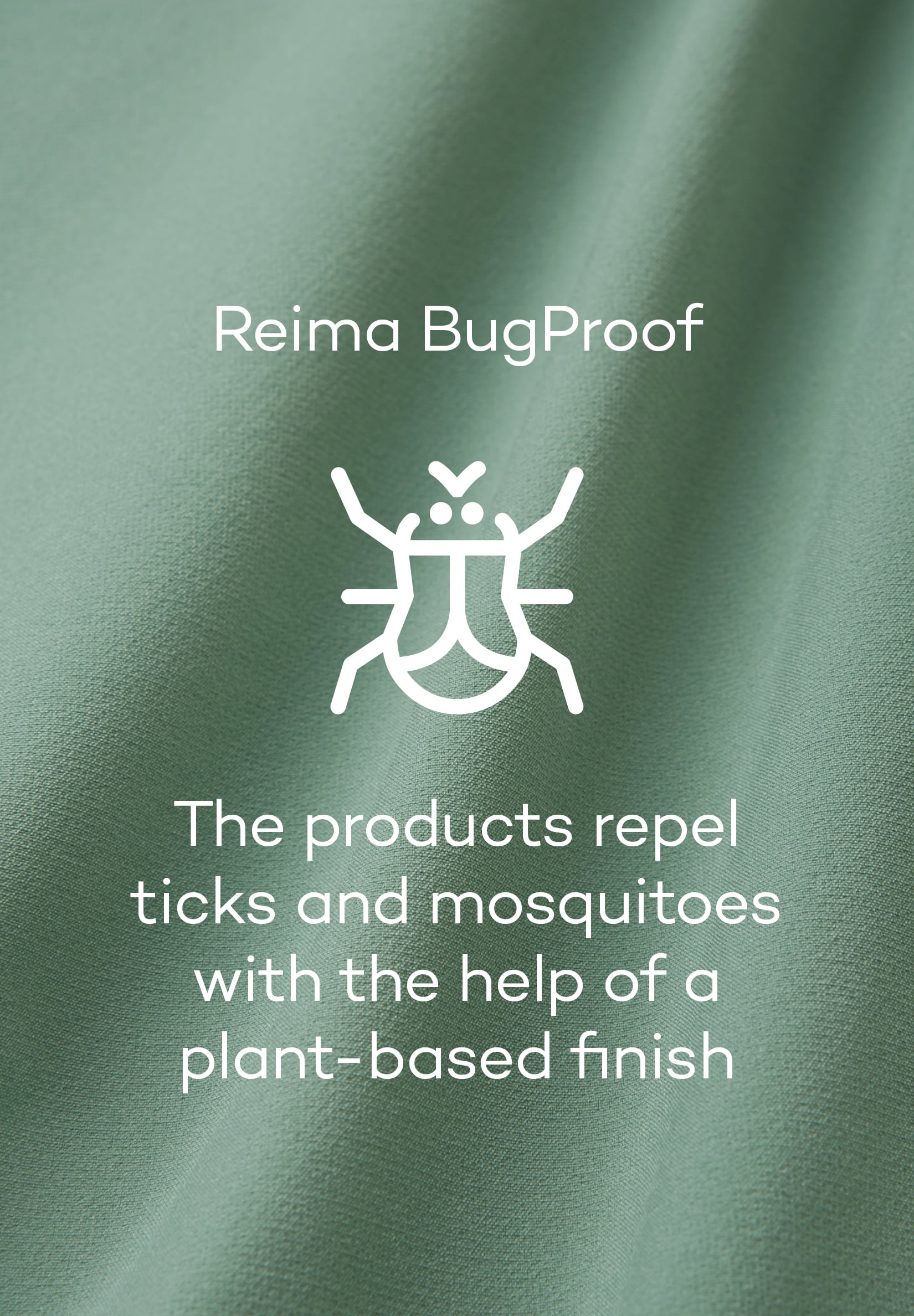 Reima BugProof bruker geraniol (biocid) fra sitrongress. Dette gir en mild duft som frastøter mygg og flått. Effekten varer i over 50 vask. Beskytter kun huden som er dekket av plagget.