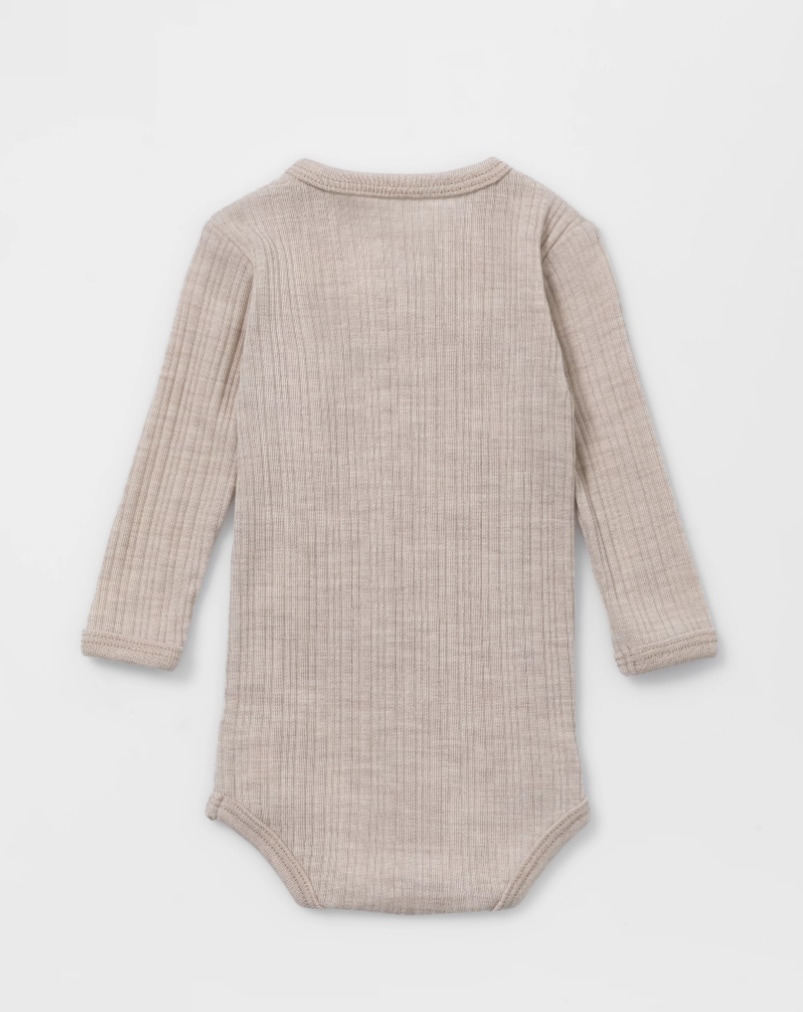 Den ribbestrikkede kvaliteten gir ekstra fleksibilitet og god bevegelighet, samtidig som merinoullens naturlige temperaturregulerende egenskaper sørger for at babyen holder en jevn og behagelig temperatur – uten å bli for varm.