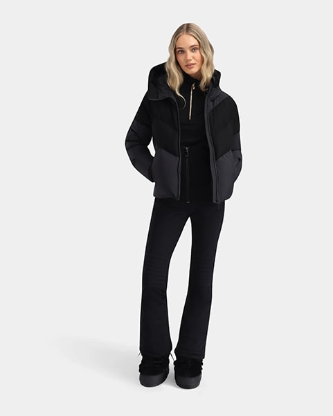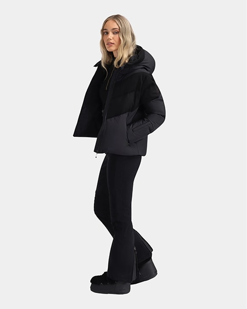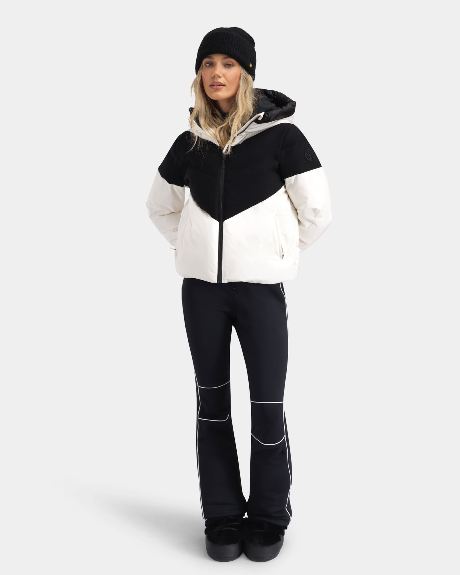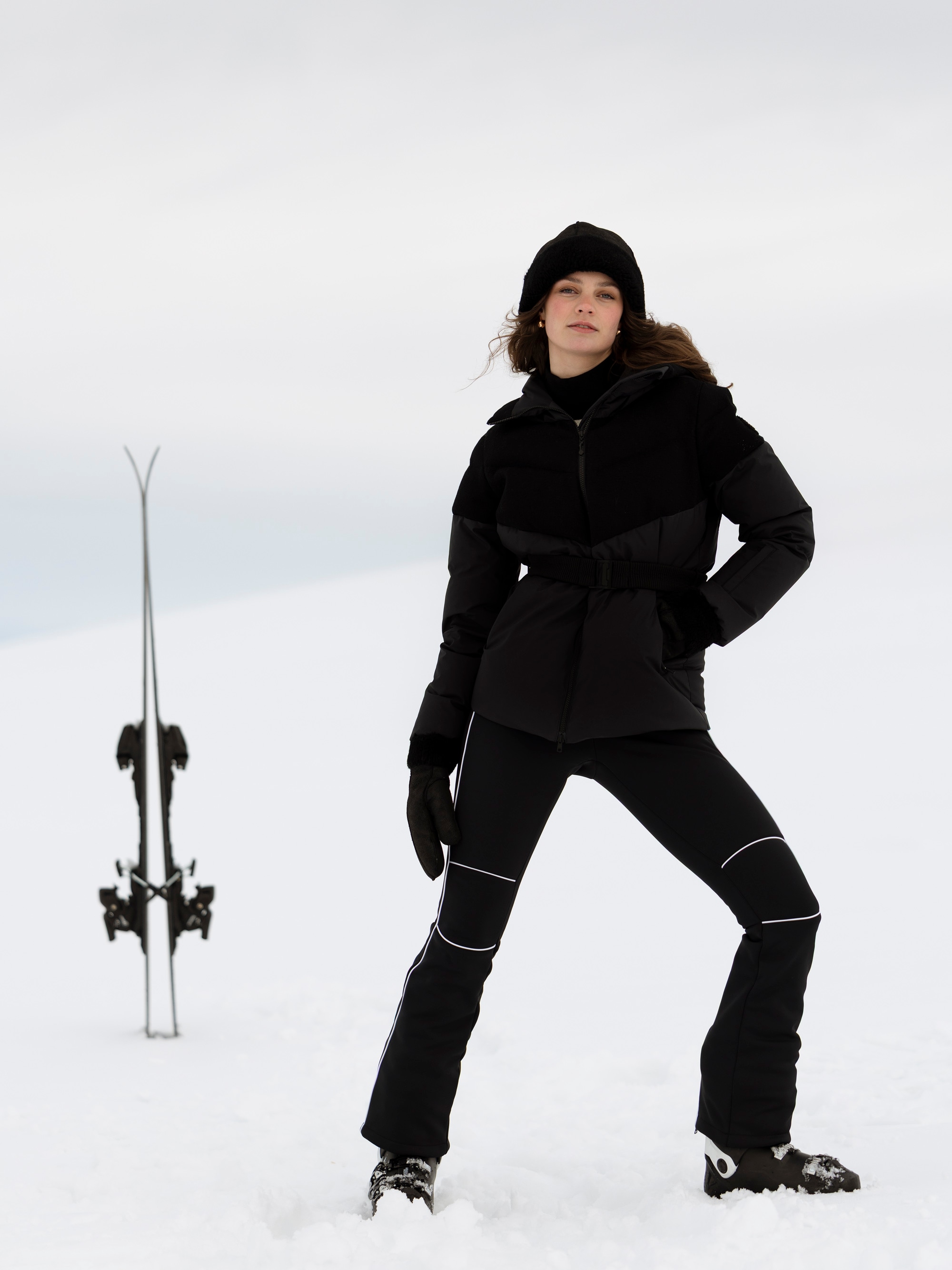 Det lette dun fyllet gir behagelig varme uten å føles tungt, mens det vindtette og vannavvisende yttermaterialet (vannsøyle 5000 mm) beskytter mot snø, vind og fukt. Jakken har en praktisk skikortlomme på ermet, justerbar snøring nederst for perfekt passform og en solid YKK-glidelås i front. Kontrastpanelet i eksklusiv ullblanding gir et sofistikert preg som løfter stilen – både på fjellet og i byen.
