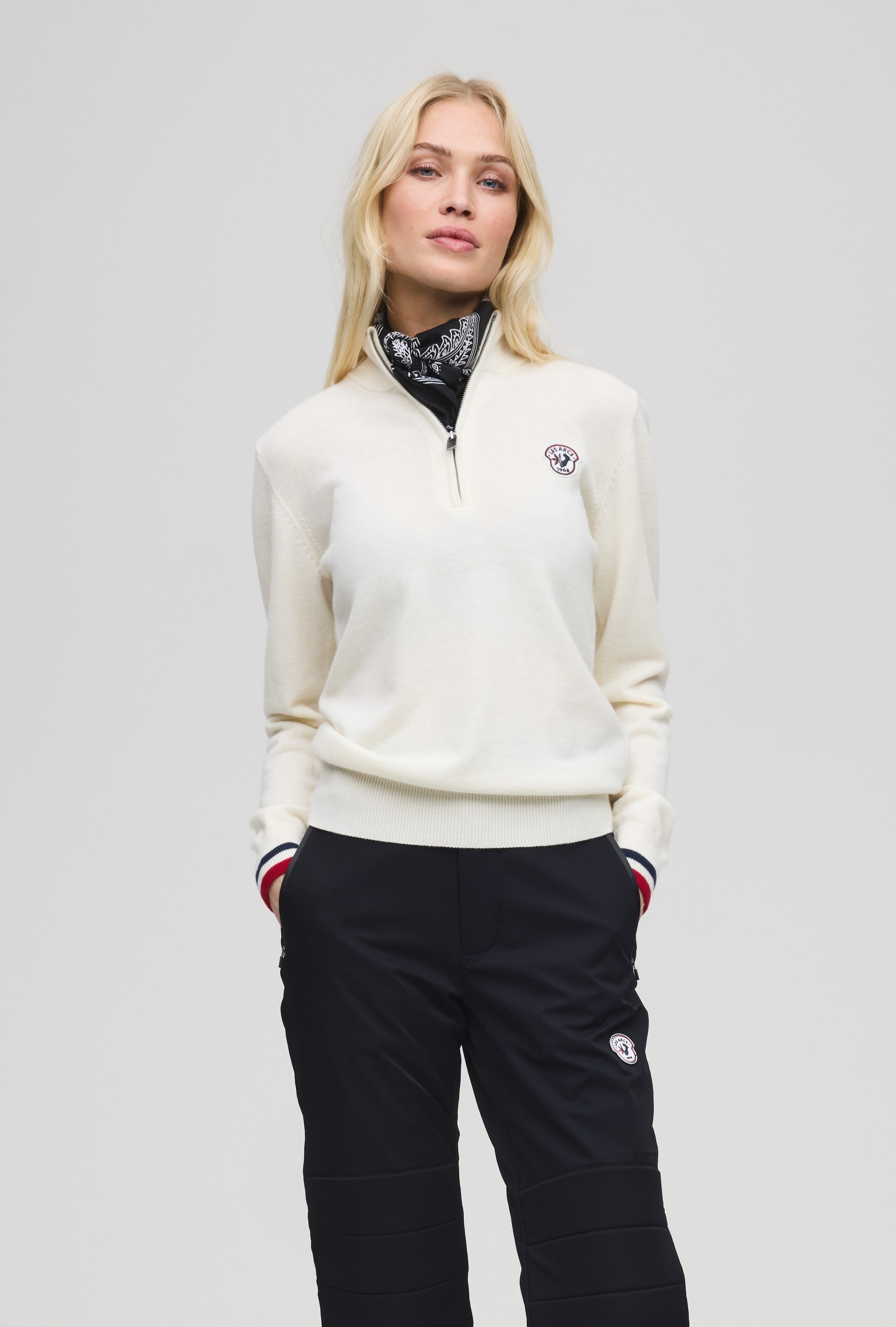 De karakteristiske franske stripene over brystet gir genseren et unikt og klassisk uttrykk. Den høye halsen med glidelås sørger for ekstra varme og fleksibilitet, enten du bruker den som et mellomlag på skitur eller som genser på kjølige dager.