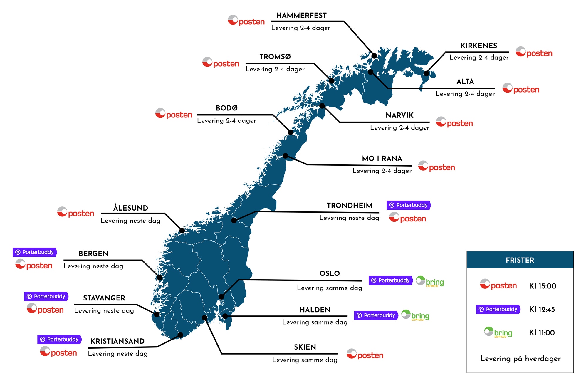 - Leveringstid: Samme dag på bestillinger gjort før 13:00 i østlandsområdet. Dagen etter i Bergen og Trondheim.