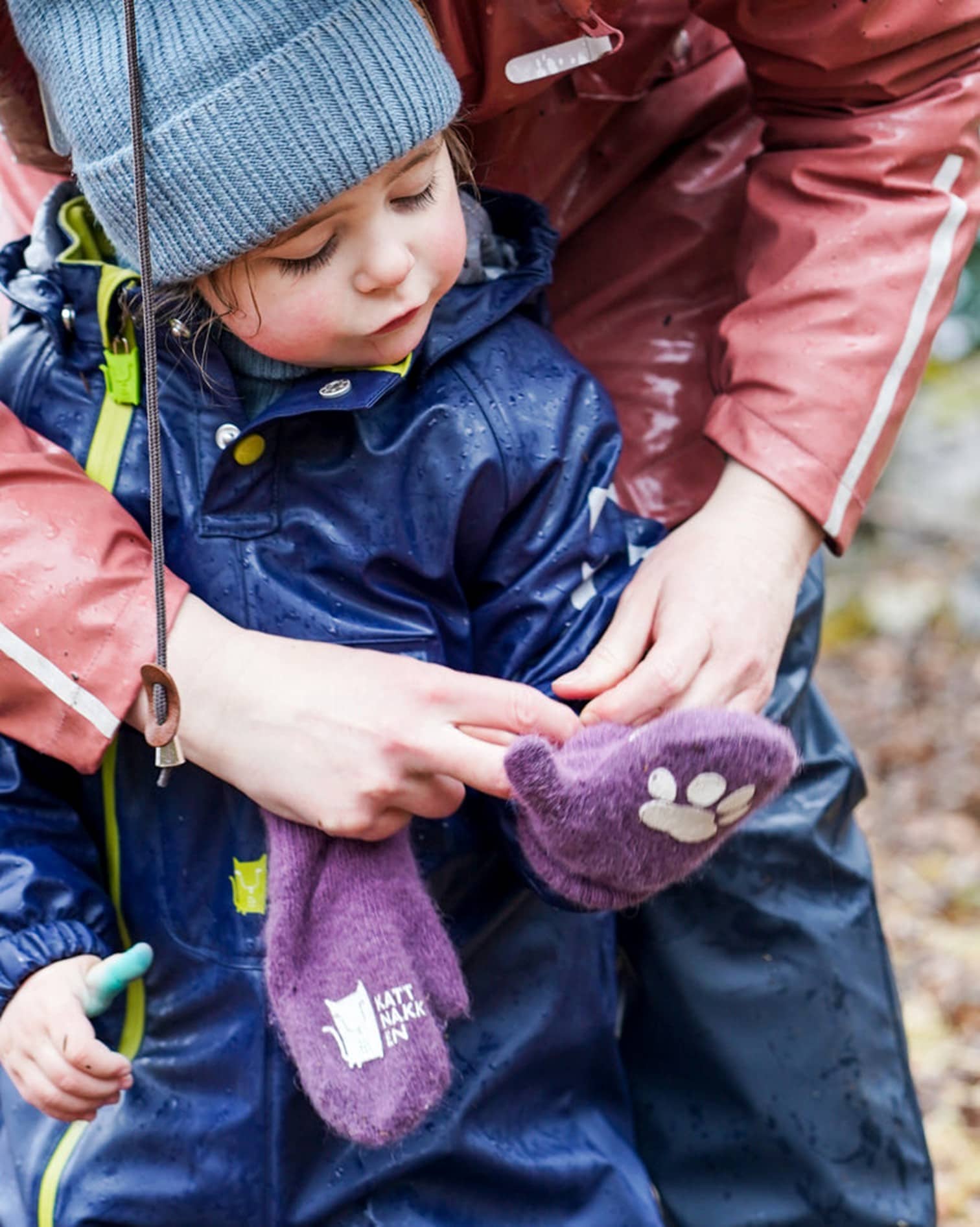 Kattnakken Magiske Ullvotter – varme selv når de er våte. Disse vottene lever virkelig opp til navnet sitt! Med 80 % ull holder de små barnehender varme, selv når vottene blir våte. Den tynne og fleksible passformen gjør det enkelt for barna å bevege hendene, noe som gjør vottene perfekte for aktiv lek. I tillegg har de sklisikkert belegg i håndflaten for bedre grep – smart og funksjonelt!
