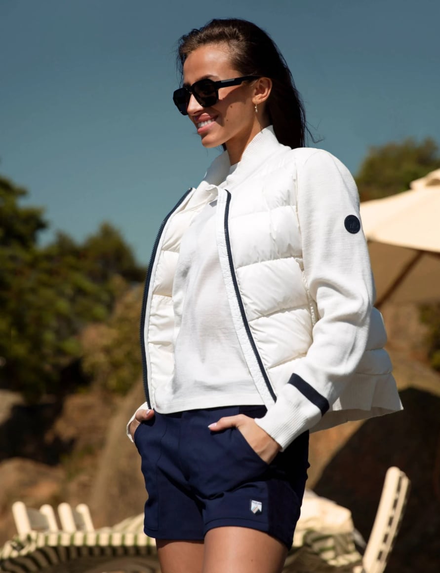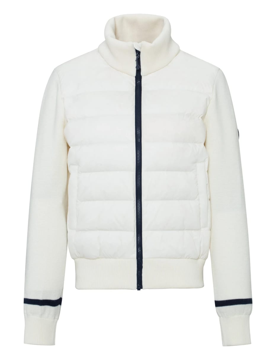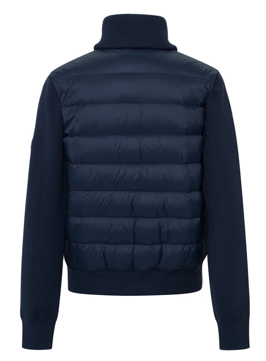 Jakken kombinerer myke, strikkede partier i ullblanding med dunfyll. Strikk i ermer, hals og midje gir fleksibel passform og holder varmen samtidig som den gir bevegelsesfrihet.