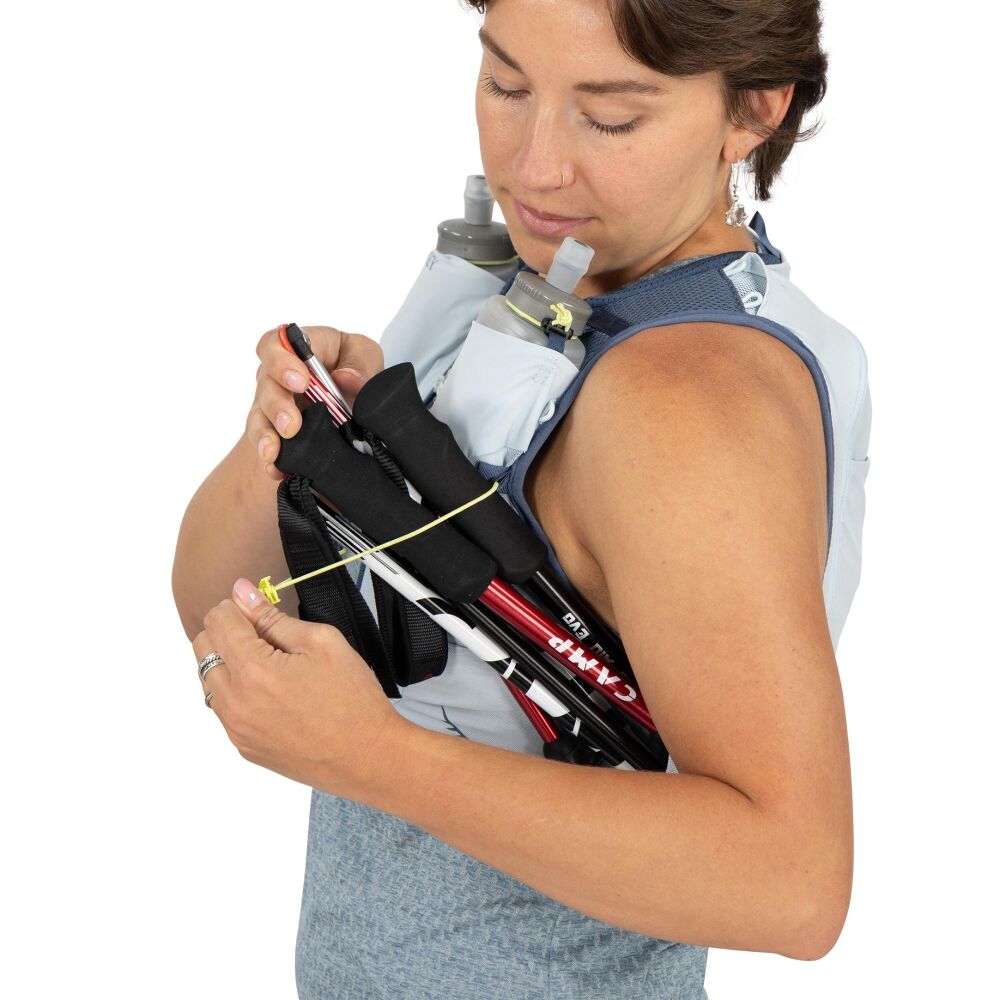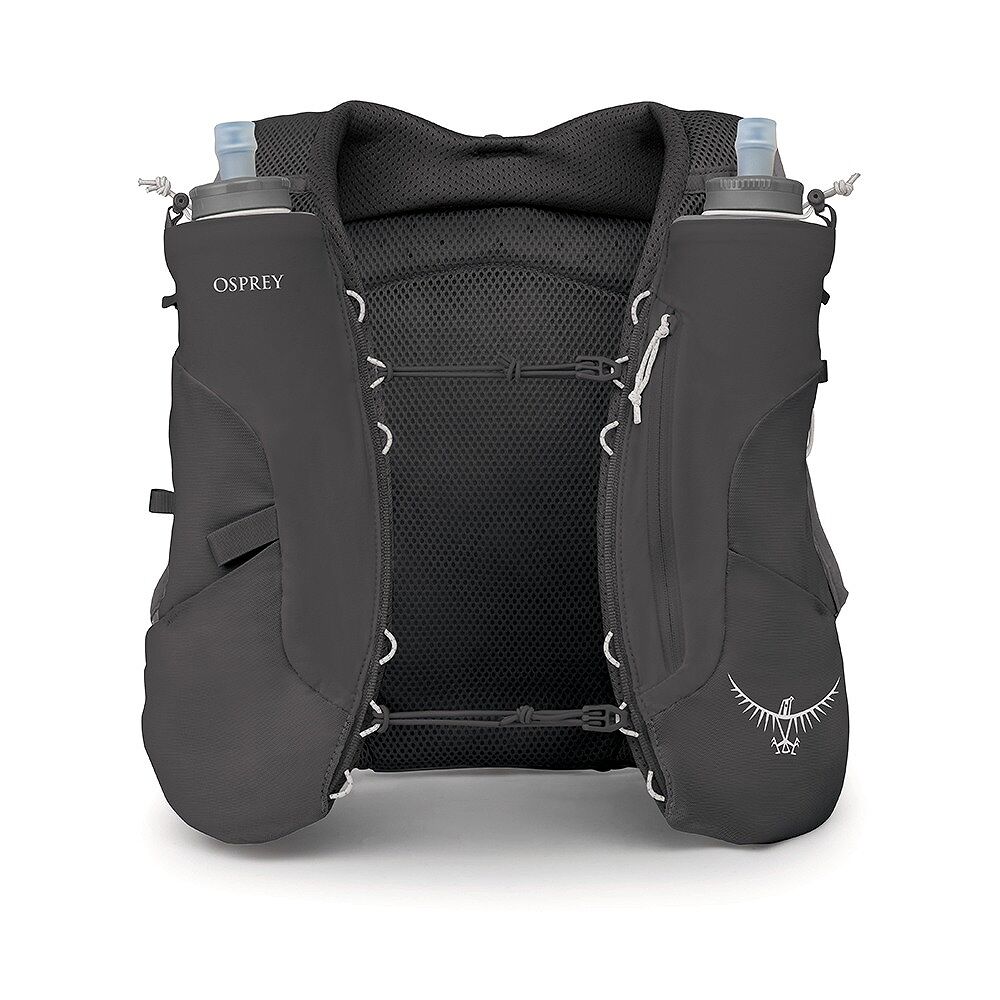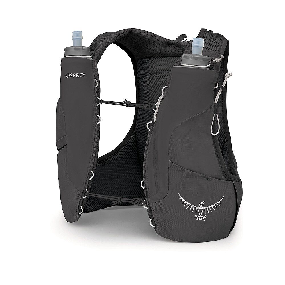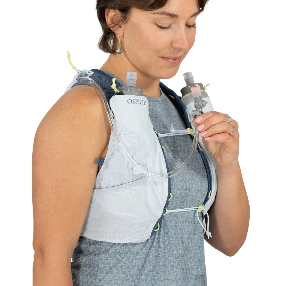 Minimalistisk Osprey løpevest for dame med stabil passform, inkluderte flasker og praktisk lagring. Designet for effektiv hydrering og komfort på korte til mellomlange løpeturer.