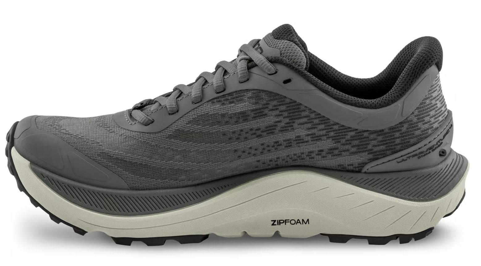 Ultraventure har en bred tåboks, noe som er særegent for Topo sine løpesko. Du får god plass til tærne som bidrar til en god følelse med underlaget og forhindrer krampe i foten. Samtidig hjelper den tærne å justere sin naturlige posisjon for bedre balanse,stabilitet og komfort. Dette går ikke utover passformen, skoen sitter veldig godt på hælen og mellomfoten. Her får du i pose og sekk med romslig tåboks uten at det går utover passformen. En støpt skumkrage og TPU hælkappe sørger for at foten sitter godt i skoen, sammen med et mikrofiberbelte som låser mellomfoten.