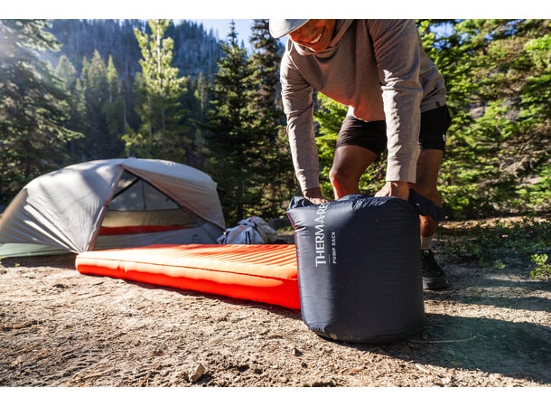 Liggeunderlaget blåses raskt opp med den medfølgende pumpesekken og TwinLock-ventilen. For lengst levetid anbefales det å tørke underlaget før lagring og unngå skarpe underlag. Oppbevar det løst og tørt når det ikke er i bruk for å bevare materialets egenskaper.