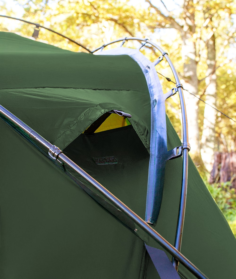 Teltet har tre lufteluker som sikrer god ventilasjon. Plasseringen av ventilasjonen reduserer kondens og bidrar til komfort gjennom natten.
