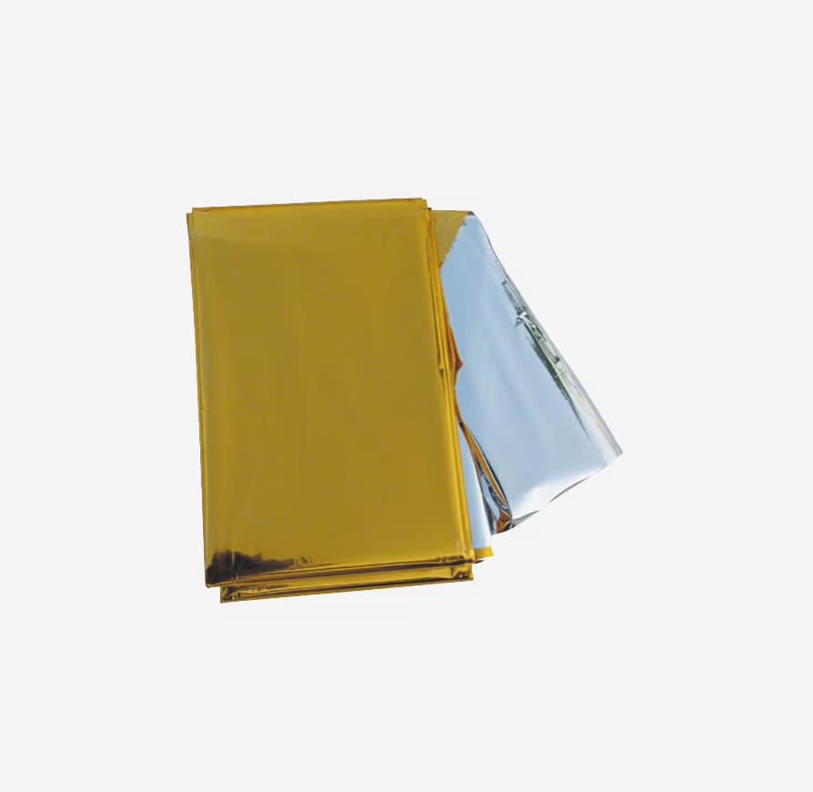 Isolerende redningsteppe med en sølvside og en gullside. Når sølvsiden vender mot kroppen, reflekteres varmen fra kroppen. Hvis du snur teppet bort fra kroppen, reflekteres varmen bort og kjøler ned kroppen. Veldig nyttig i både varme og kalde omgivelser.