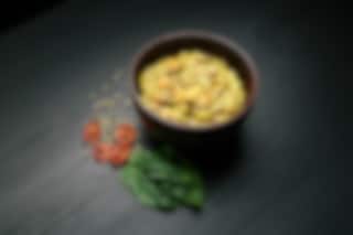 Couscous (hvete) (32%), linser (12%), soyakjøtt (soya (98%), salt, chili) (12%), gulrot, fløte(melk), løk, brekkbønner, blomkål, maisstivelse, rapsolje, spinat (2,7%), selleri, soyasaus, grønnsakbuljong (soya), hvitløk, krydder, antioksidant (askorbinsyre).