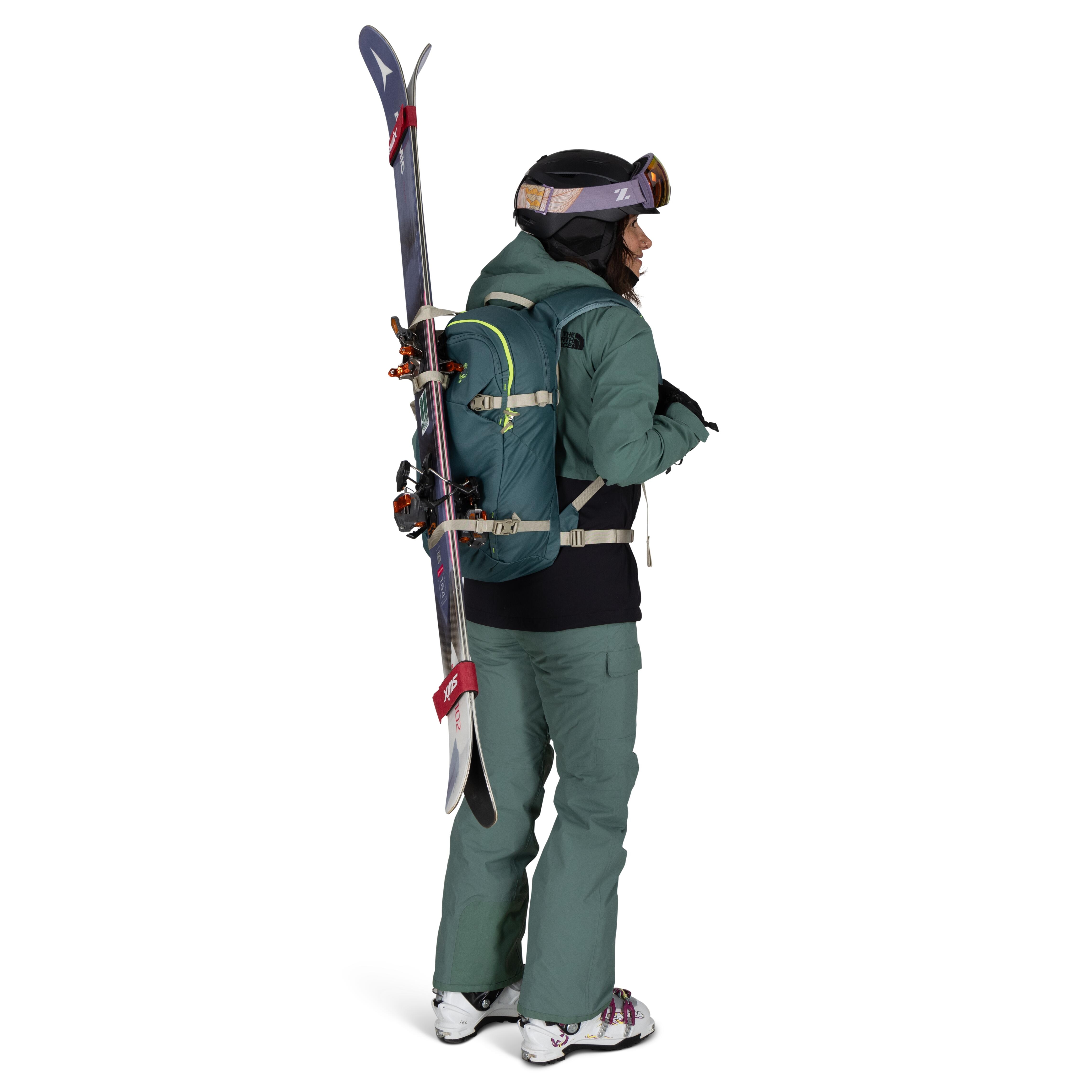 Sekken har isolerte skulderremmer sørger for at vannet ikke fryser når du tar runde etter runde i skiheisen eller går en lang skitur i vinterkulden. A-rammen og det diagonale skifestet eller snowboard-/trugefestet i frontpanelet er til god hjelp når du tar bena fatt på vei mot urørt pudder. Med et separat rom for skredutstyr.