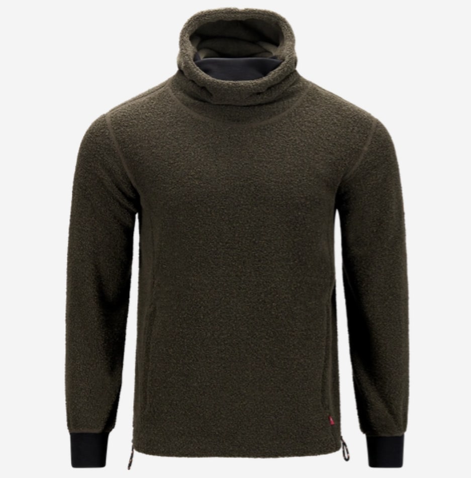 Nye Reborn Wool Terry er laget i 62% resirkulert merinoull, 23% resirkulert polyamide, 12% resirkulert polyster og 3% andre fibre. En komfortabel og myk frotte som er både slitesterk og anvendelig, med håndvarmer-lommer. Når kolleksjonen ble laget hadde de et ønske om å ikke bruke lær eller plast, derfor er hempe til glidelås og logo laget av fiskegarn.