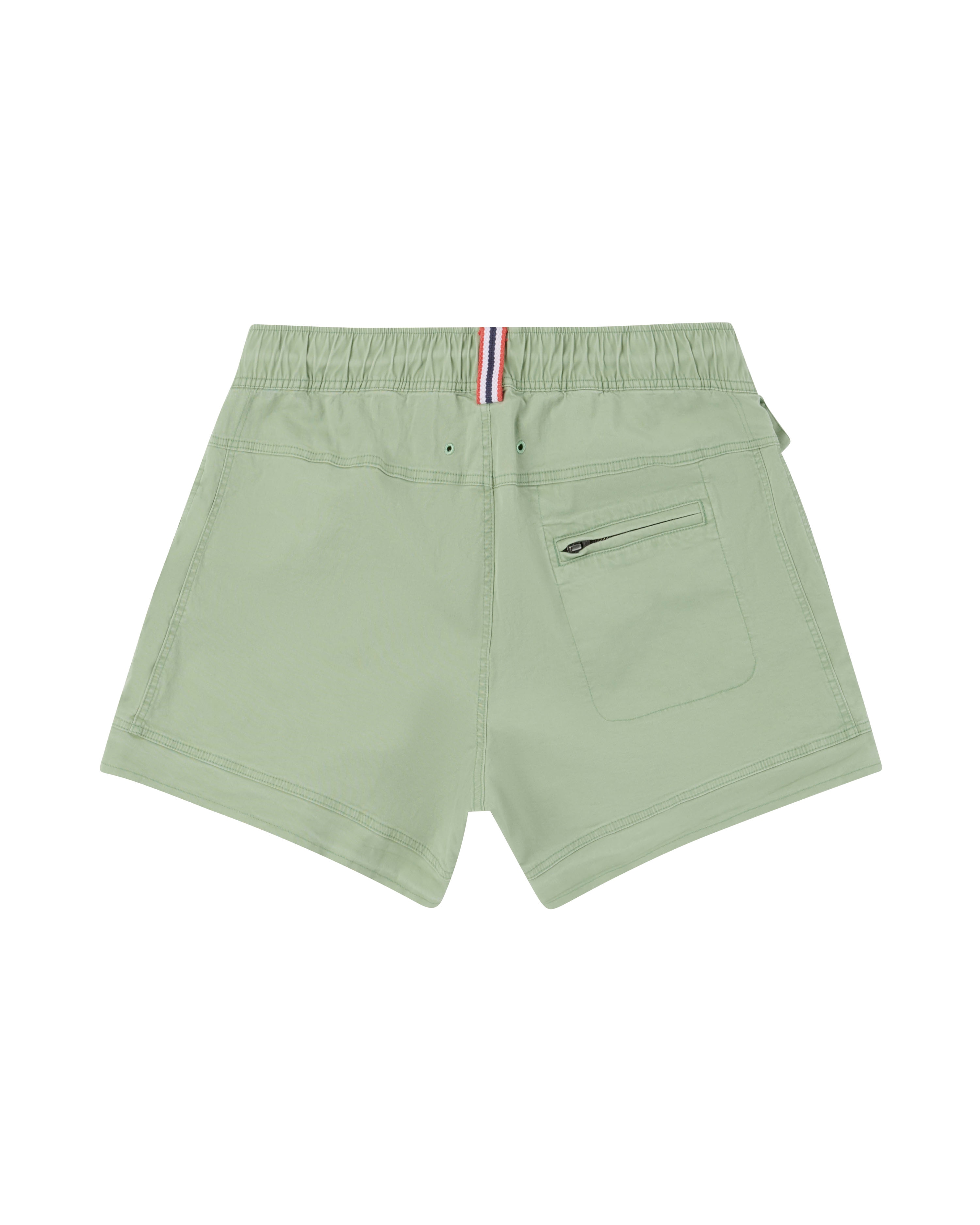Shortsen er laget i bomullstwill med elastan for stretch og bevegelsesfrihet. Materialet puster godt, mens ventilasjonshull (eyelets) øker luftgjennomstrømning. Enzymvask gir mykhet og komfort over tid.