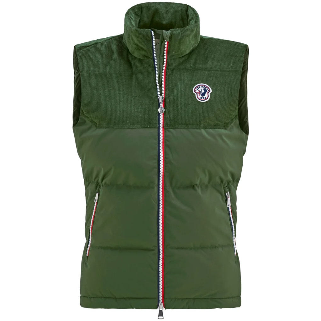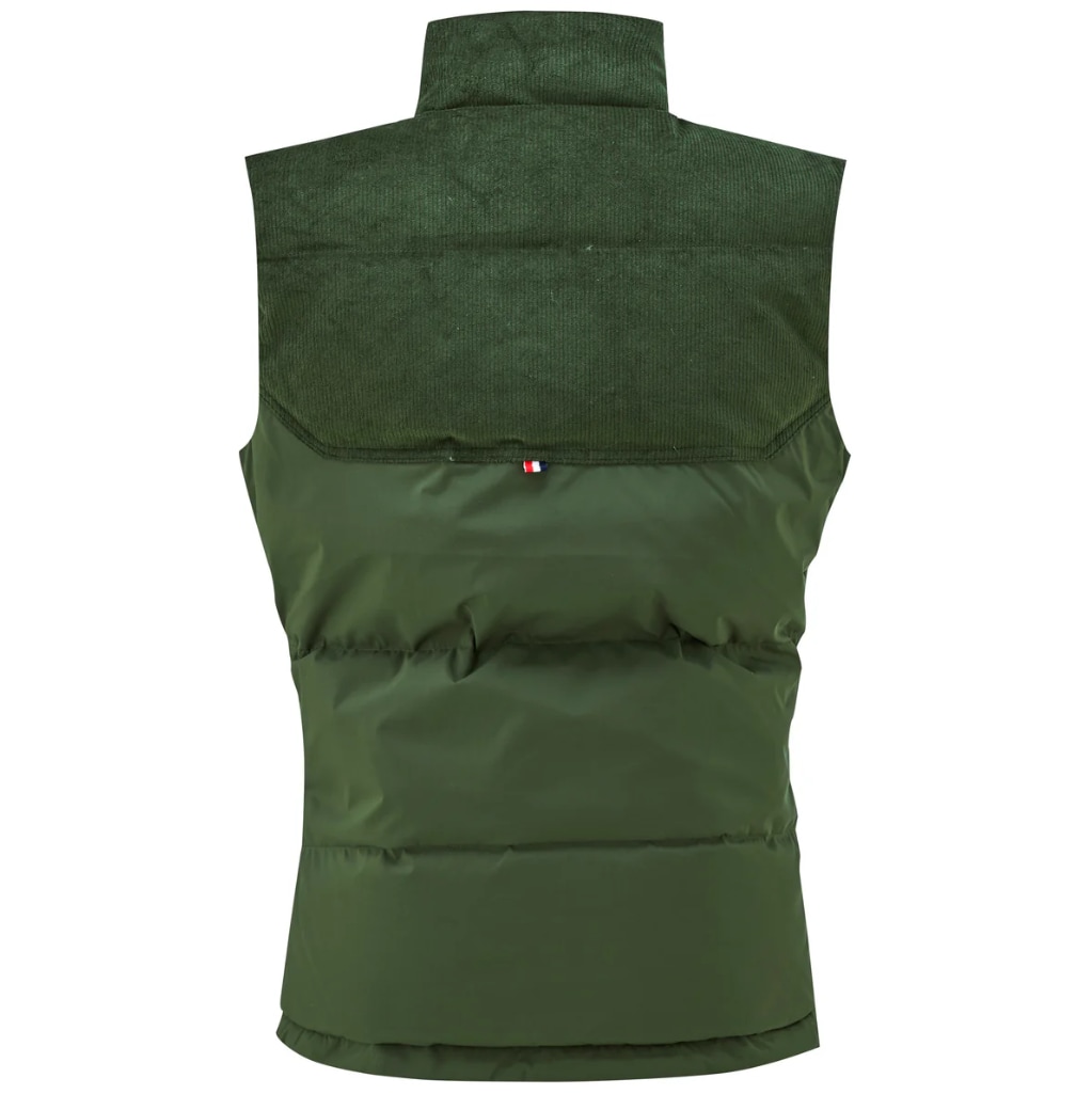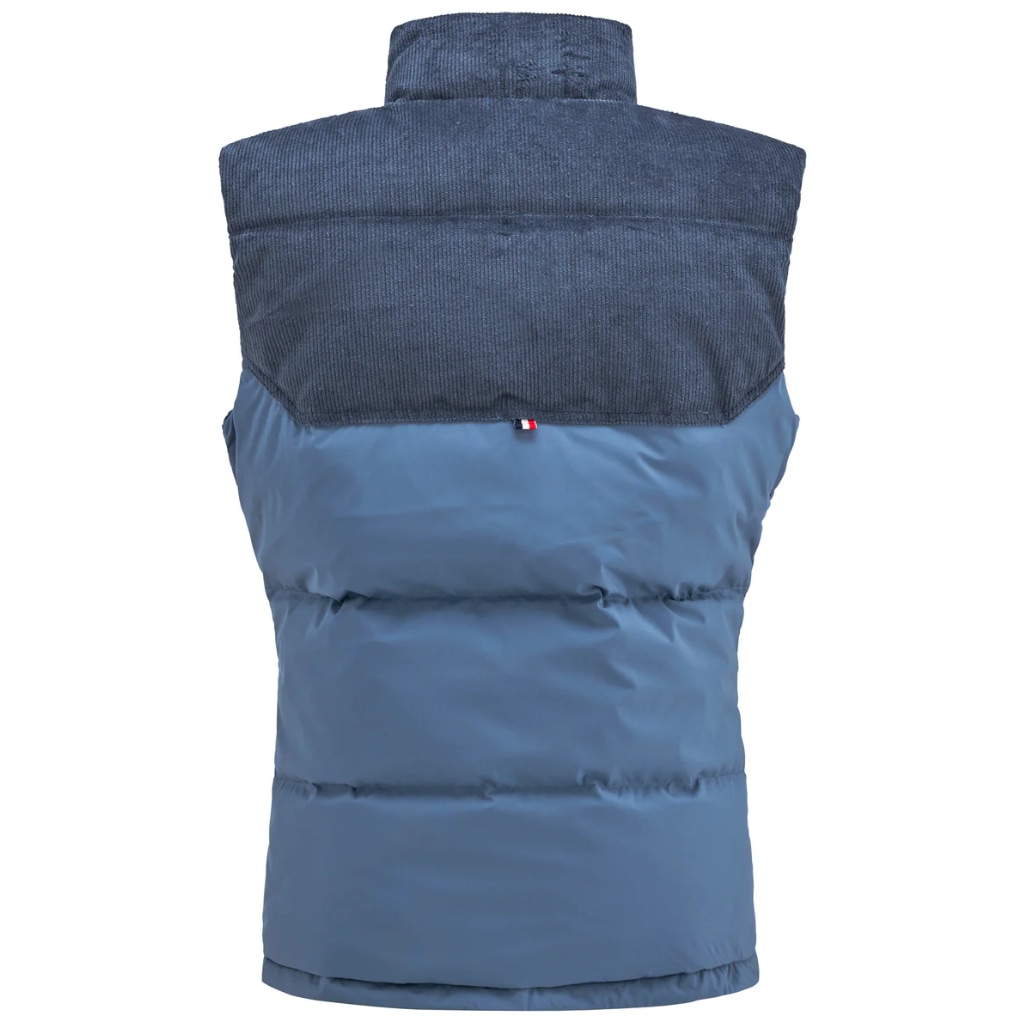 Fylt med høykvalitets 90/10 gåsedun, gir den lett og behagelig varme uten å gå på kompromiss med bevegelighet. To praktiske håndlommer i front og detaljer med franske farger i glidelåsene gir vesten et unikt og gjennomført design.