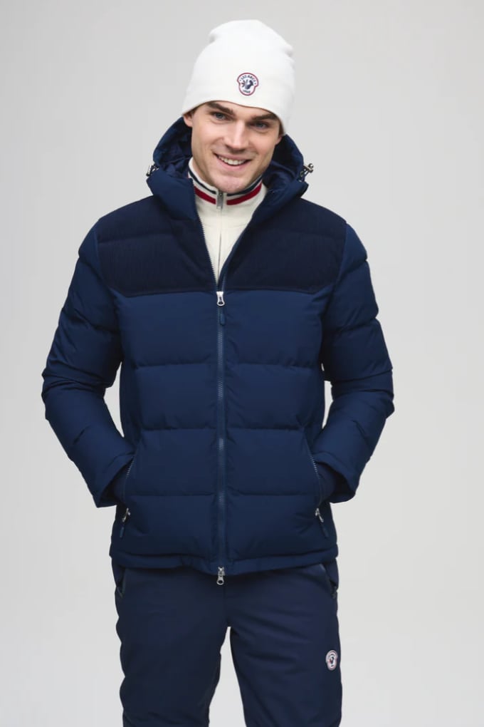 Les Arcs Albert Cord Jacket, Herre er en moderne dunjakke med en elegant vri – perfekt balansert mellom funksjon og stil. Den kombinerer matt, slitesterk nylon med myk, ton-i-ton cordfløyel over skuldrene for et unikt og sofistikert uttrykk.