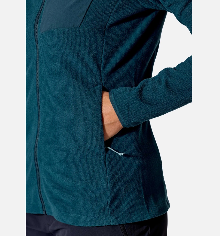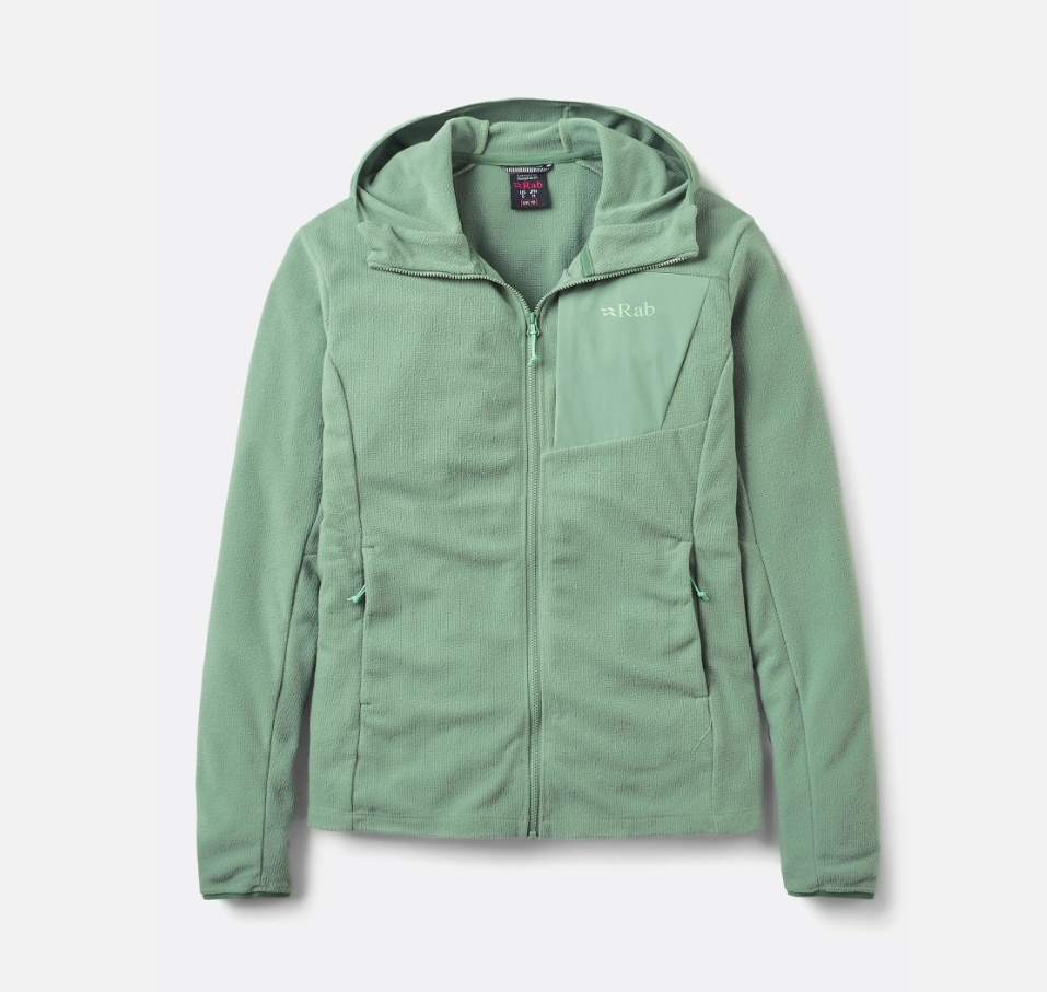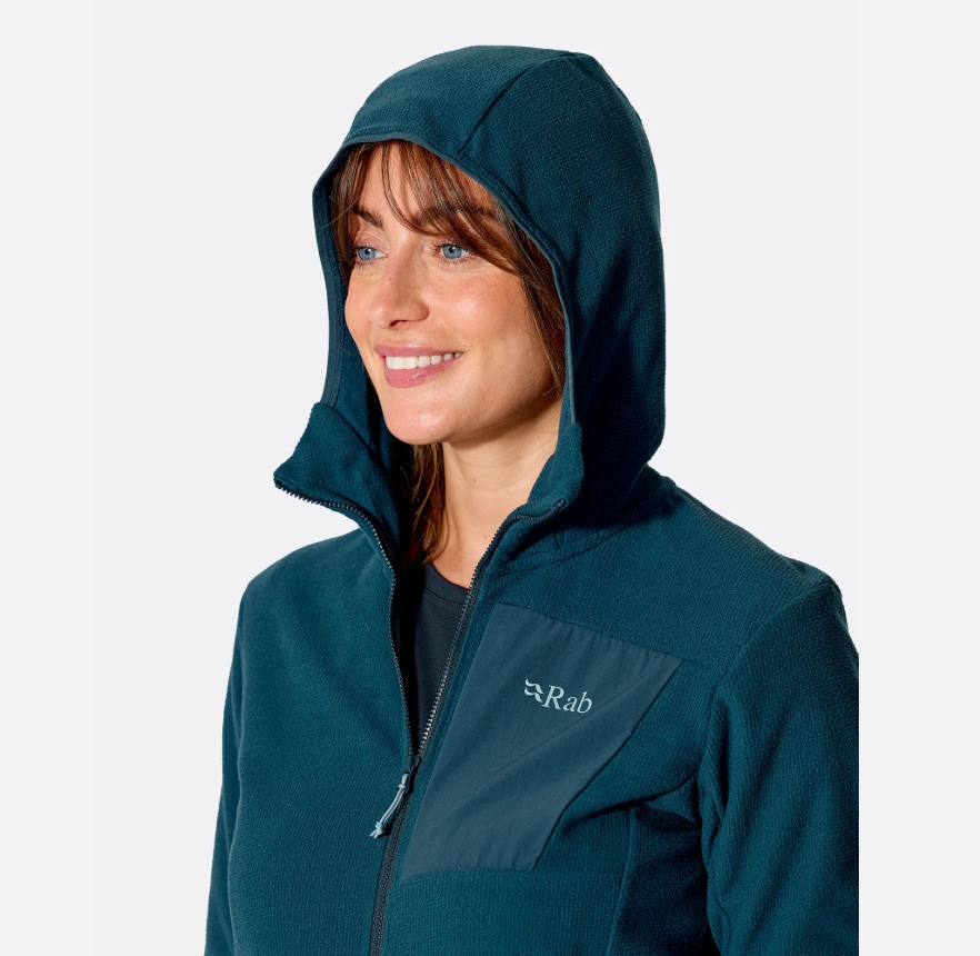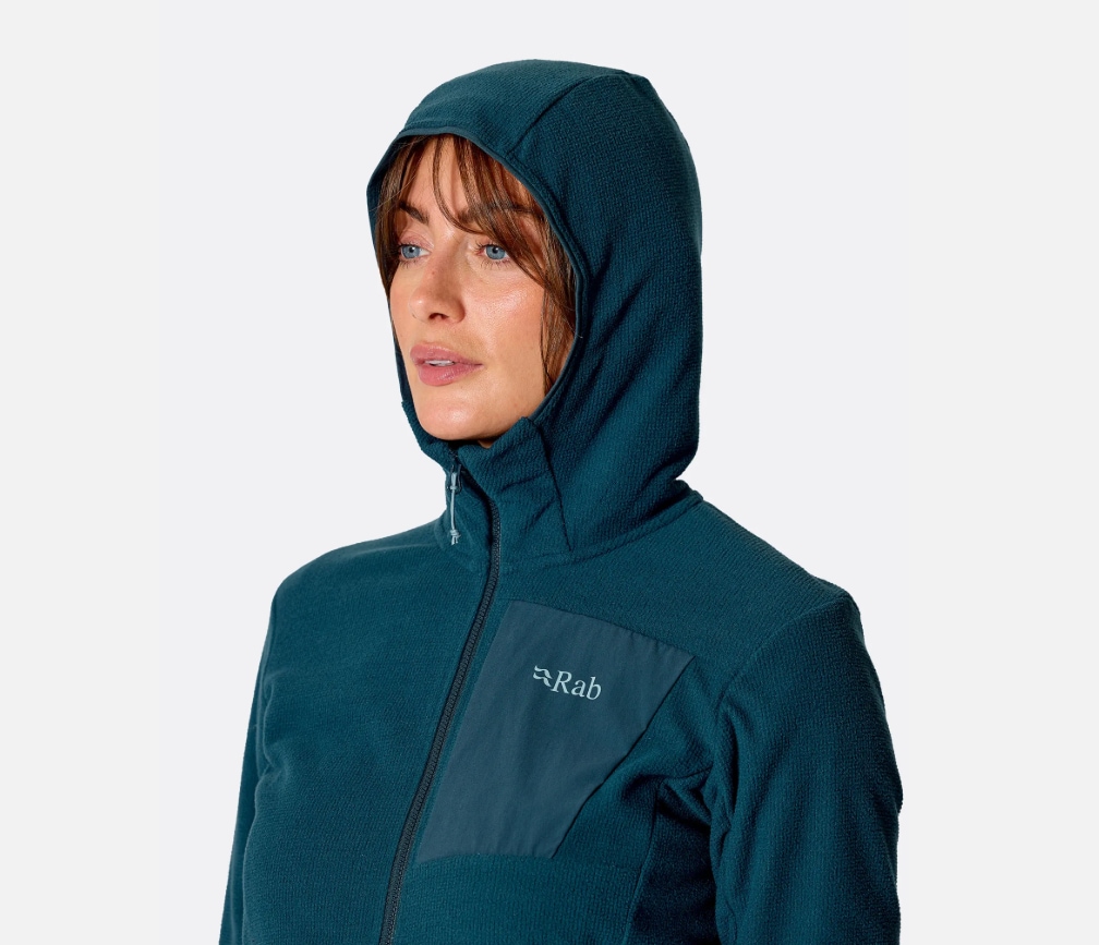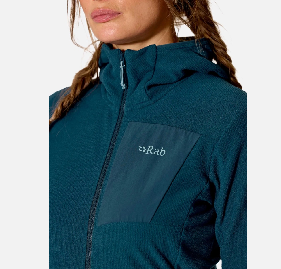 RAB Tecton Hoody Women er en funksjonell hettegenser utviklet som mellomlag. Den gir varme, god pusteevne og lav vekt, og fungerer like godt alene som under skalljakke.