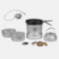 Settet har spritbrenner, gassbrenner, 2 kjeler på 1,75 og 1,5 liter, kaffekjele på 0,9 liter og en stekepanne på 22 cm i diameter. Stekepannen har non-stick som gjør at maten ikke setter seg så lett fast. Her kan du enkelt velge mellom sprit- eller gassbrenner.